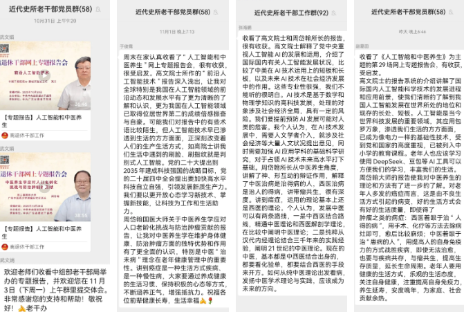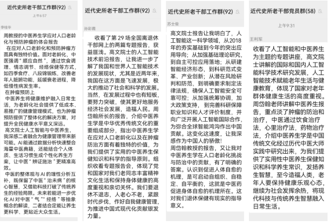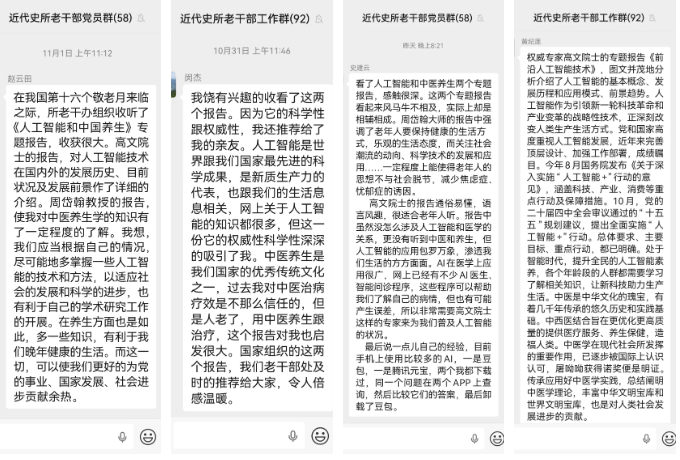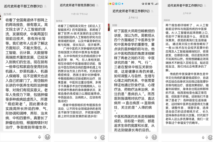 在职干部聂永梅感言说,与离退休老师一同在线收看了专题报告,结合群内前辈们的分享交流,倍感启发。对人工智能技术的前沿发展与应用场景有了全新认知,智能技术正改变我们的工作和生活方式。人口老龄化与健康保障,从中医养生视角阐释了应对老龄化挑战、助力肿瘤防治等,这既为关爱离退休老同志身心健康提供了科学指引,也让我深刻认识到传统医学文化的时代价值,更坚定了为在职和离退休老师做好服务保障工作的责任感。