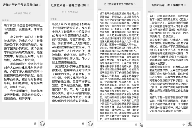 本场报告会分为上下两篇,上篇由中国工程院院士高文作“前沿人工智能技术”专题报告,下篇由广东省广州中医药大学肿瘤研究所所长周岱翰作“中医养生学应对人口老龄化挑战与防治肿瘤的贡献”专题报告。两报告紧扣时代脉搏,主题鲜明、信息量大,引发老同志在微信群畅谈所思所想、所感所悟。所党委书记、离退休干部工作领导小组组长于俊霄在微信群与老同志互动交流;党办主任(综合处处长)聂永梅收看后积极提交体会。报告会不仅让大家深刻体会到国家对离退休老同志的关怀与重视,还为老同志打开了一扇瞭望国家前沿科技、关注健康生活的新窗口,意义深远,收获颇丰。