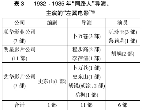 (20)“同路人”的具体名单,主要是辨别夏衍、阳翰笙和鲁涤平等人的论述而定。因联华影业公司的导演孙瑜拍摄《天明》、费穆拍摄《城市之夜》、蔡楚生制作《都会的早晨》,并非出于左翼影人的直接争取,而是出于左翼影评影响等因,故在表中不予列出。参见夏衍:《懒寻旧梦录》,第234页;鲁涤平:《电影艺术与共产党》)(1933年4月3日),中国第二历史档案馆编:《中华民国史档案资料汇编》第五辑第一编,《文化》(一),第383页;阳翰笙:《泥泞中的战斗——影事回忆录》,《电影艺术》1986年第1期,第59页。