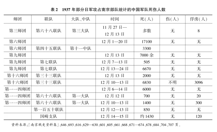 上海沦陷后中国军队西撤,且战且退,沿途除上海附近,没有出现大量的俘虏,也没有大规模的死尸。激烈战斗、大量尸体的出现(主要是日军屠杀俘虏),主要发生在中国军队退无可退的南京战役中。从日军的第一手记载看,到南京城破前,死亡人数远多于负伤人数,“敌人弃尸”更是多于俘虏(参见表2)。