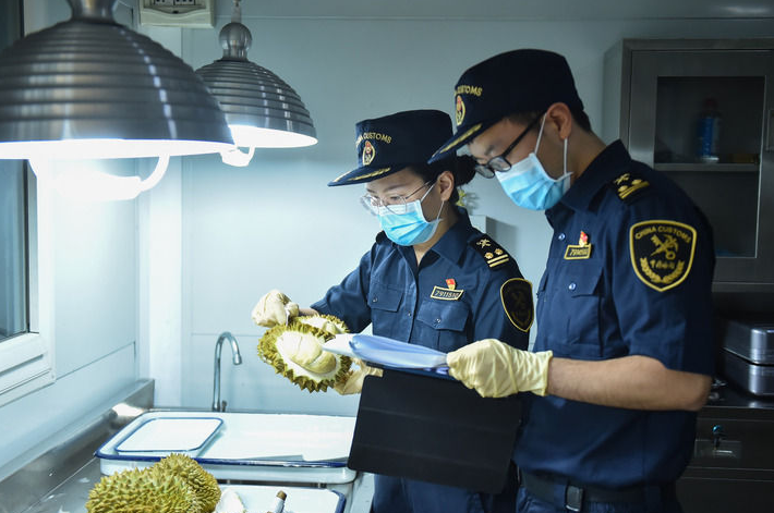 2024年6月21日,海关关员在成都航空口岸进口水果检疫区查验榴莲。新华社发(邓茗芳 摄)