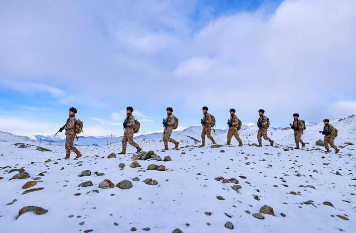 2024年2月9日,驻守帕米尔高原的新疆军区某边防团红其拉甫边防连官兵踏雪巡逻。新华社发(姬文志 摄)